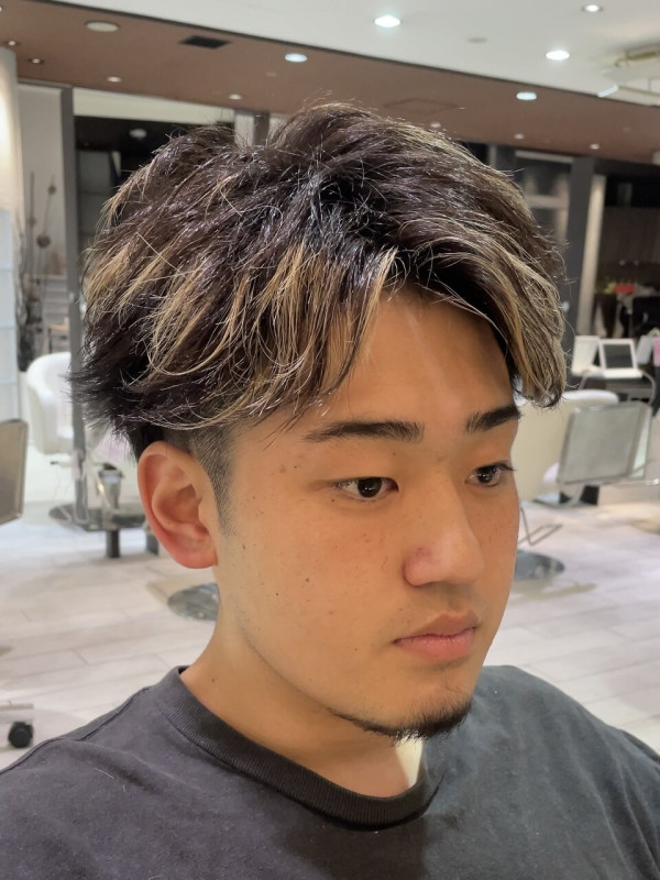 ハイライトを入れることで髪全体に立体感が生まれ、そこにフェザーのように軽く動くパーマを重ねることで、動きがより強調されます。スタイリング剤を揉み込むだけで、複雑な動きと色のコントラストが際立ち、洗練された個性を表現できます。