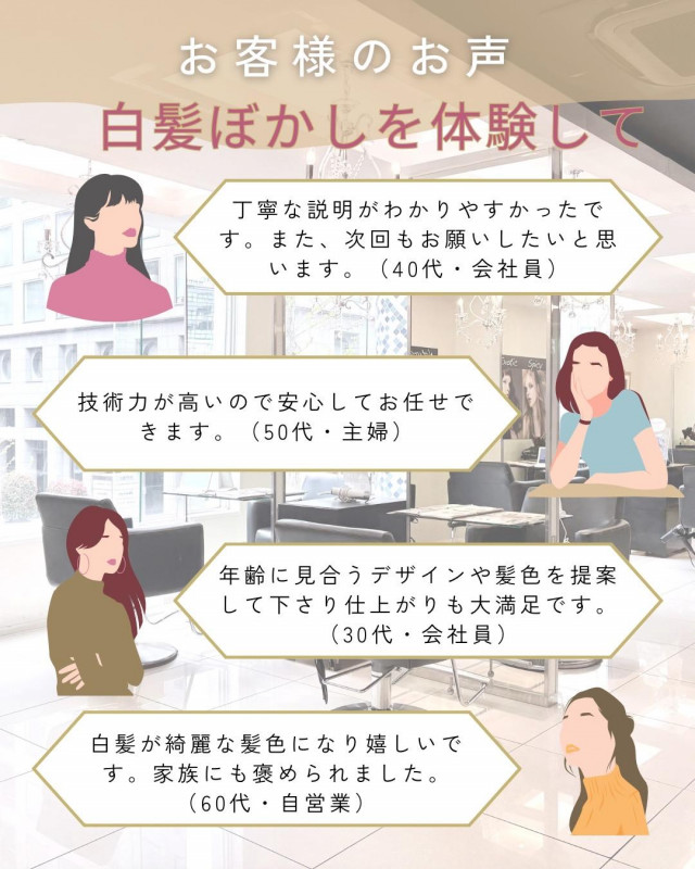白髪・パサつき・白髪染めの限られた髪色・ボリュームダウンこれらの老けて見える原因を改善できるので若く見える白髪ぼかしは、大人世代の女性にとって必要な施術方法になります。