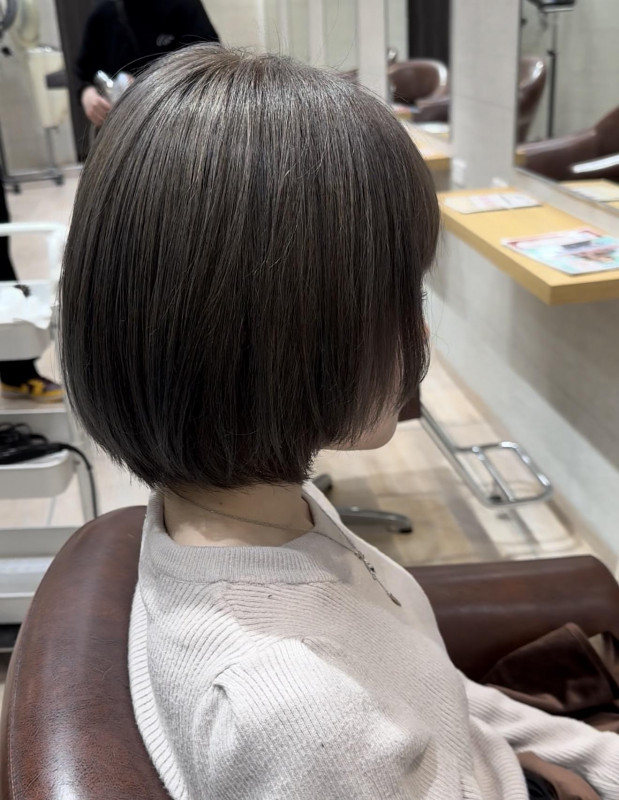クールで大人っぽい印象にしたいならアッシュグレー。落ち着いた色味ながらツヤ感があり、髪全体が軽やかに見えるのがポイント。秋冬の重めコーデにも映える、モード感のある万能カラーです。