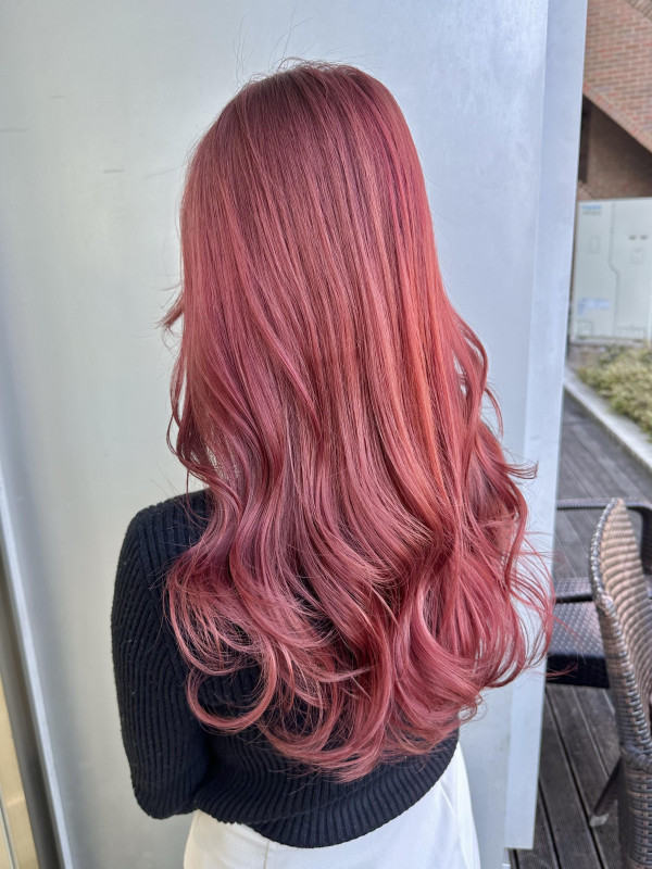 こちらはブリーチ1回〜2回でできる、赤味多めのネオンピンクカラー
