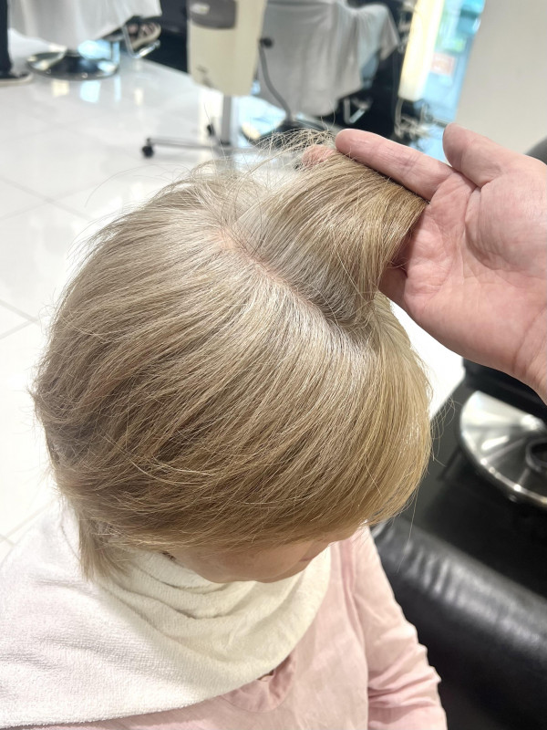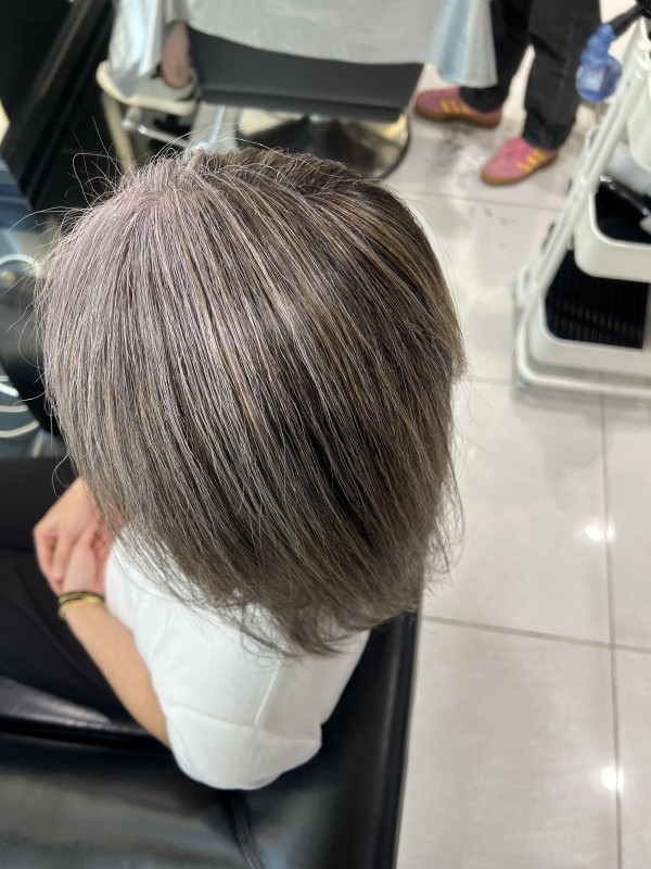 この方は前の方に白髪が集中しているのでトップにハイライトを入れて擬似白髪を作りました。