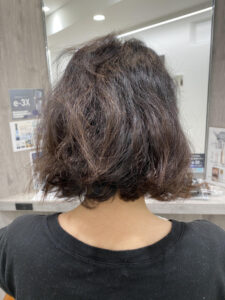 大きくうねりがあり、細かい毛の毛羽立ちとパサっと見える髪が、 AFTER この通り、綺麗に仕上がりました。これ、ドライヤーで乾かしただけです…。素晴らしい!ぱさつき感もなく艶々の仕上がりになりました。