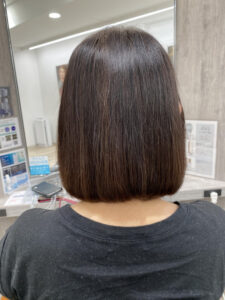 乾かしただけでもこの仕上がりに!!艶もまとまりもでて綺麗になりました。扱いやすさも格段に良くなり、施術前と比べても一目瞭然。ボブスタイルの特徴でもカットラインが綺麗に見えるようになりました。やはり控えめに言っても縮毛矯正とボブスタイルの相性はかなり良いと言えるでしょう。