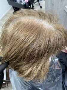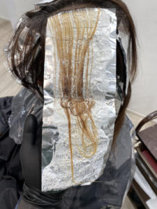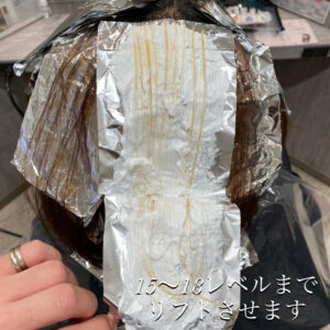 根元の白髪に近づける様に明るくしていきます。この際履歴によってはムラになったり色が綺麗にならなかったりがあるのでブリーチをする美容師さんはしっかりと見極めて施術していきましょう。