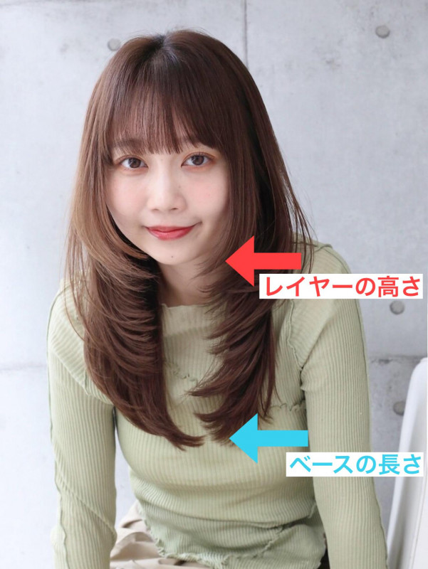 レイヤーの高さとは、ベースの髪の毛の長さから、レイヤーがどの高さで入っているかを指します。
