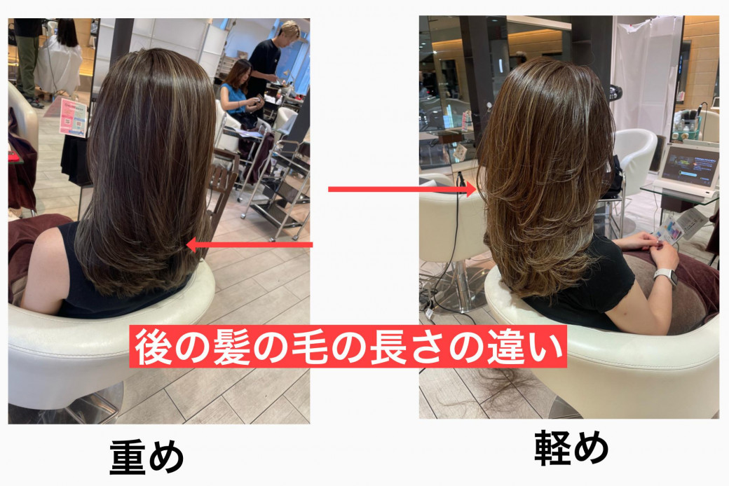 レイヤーの高さについては、主に前からの印象で決まりましたが、全体の軽さについては後ろの髪の毛の長さで決めてあげるのがわかりやすいです。