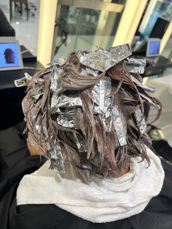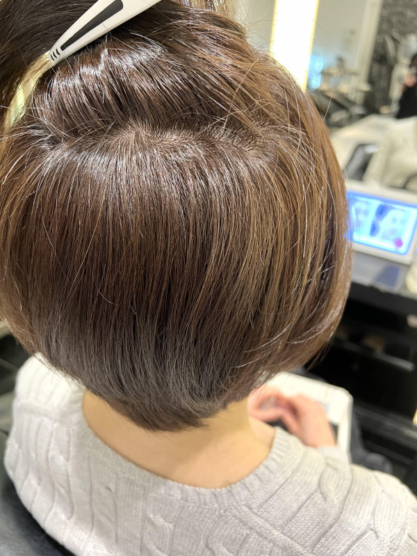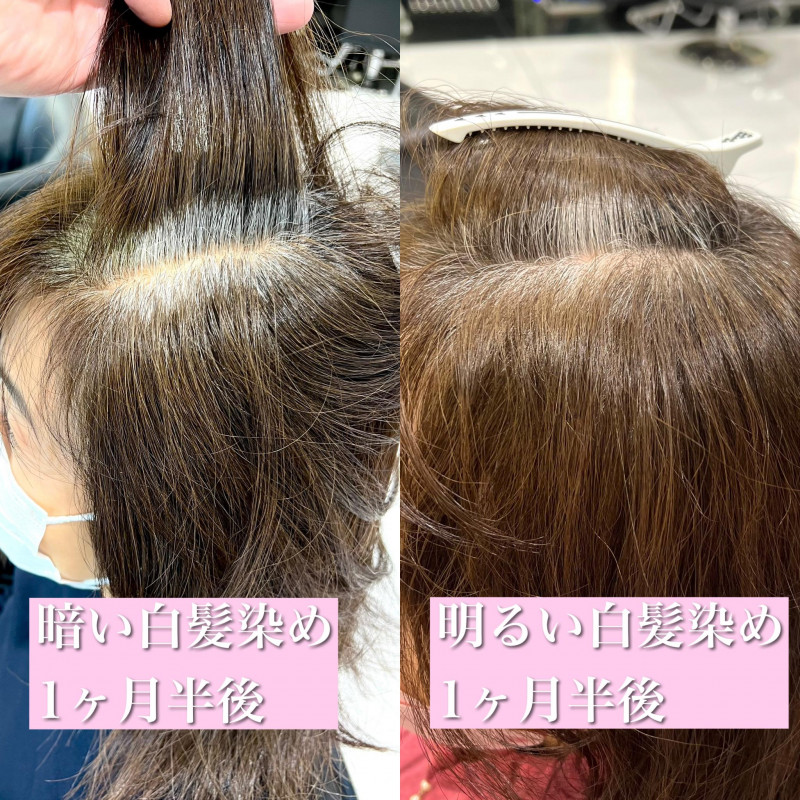 先程から生えて来た白髪と白髪を既に染めた所のコントラストを無くすと言っていたので、明るく染める良さをご紹介。